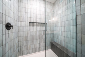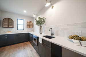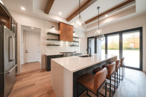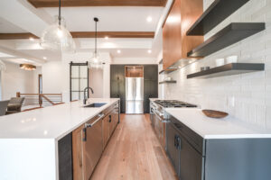 - Custom Touches: Quartz counters and waterfall edges on the island compliment a beautiful tile backsplash, custom range hood and floating shelves