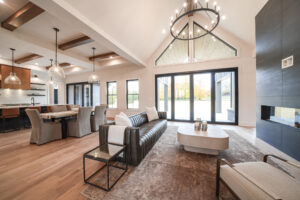 Step inside the foyer and be captivated by the open concept layout and soaring cathedral ceiling in the great room that peaks at nearly eighteen feet. This main living area is showered in natural light provided by the custom triangular windows along with a row of breakaway glass doors. This room is anchored by a linear electric fireplace surrounded with floor to ceiling tile with custom built-ins that frame the space. Hardwood flooring flows throughout the main living areas from the kitchen, open dining and to the additional sitting room, adjacent to the great room.